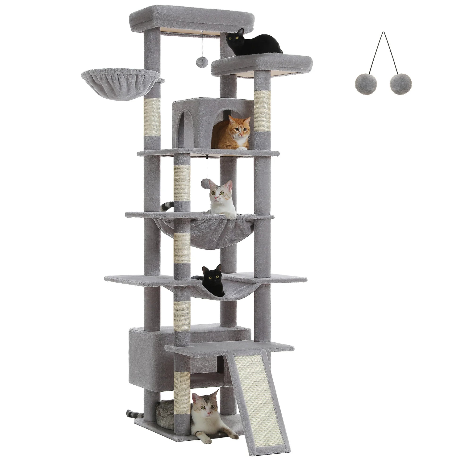 - Sisal scratching & interactive play — six durable sisal posts, a 2-in-1 scratch pad runway, plus two dangling toys with one replacement ball to keep claws sharp and boredom at bay.